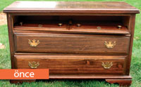 1. Dresuarı kireçtaşı boyasıyla boyayarak, zımparalama aşamasını direkt geçebilirsiniz. Daha sonra, istediğiniz renk geçişlerini vermek ve elde etmek istediği parlaklığa kavuşmak için önce açık cila sonra koyu cila kullanarak obilyayı cilalayın. Üstten ilk iki çekmeceyi söküp çekmece altlarını televizyon ekipmanları ile kutuları taşıması için raf haline getirebilirsiniz.