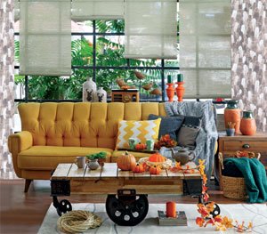 Duvar kağıdı, HannaHome. Kanepe, kahve ve gri yastıklar, sütlük, kupa, ham ahşap kuşlu stand, römorklu kaktüs aranjmanı, yeşil yapraklı kupalar, Tepe Home. Sarı çizgili yastık, ham ahşap sehpa, yan sehpa, turuncu vazolar, turuncu mumluklar, geyikli vazolar, radyo, gri throw, gri saksılı kaktüs, Mudo Concept. Bal kabakları, kuru dallar, hasır çelenkler, Euro Flora. Halı, stor perdeler, Ikea. Sepet, içindeki battaniye, H&M Home.