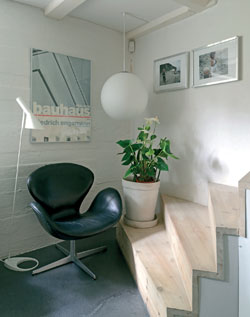 Evin alt katına çalışma odasına açılan merdivenlerden iniliyor. Dekorasyonunda Flea Market’ten seçilen ikinci el mobilya ve aksesuarların kullanıldığı odanın girişine, Stilleben’den alınan lambader ve koltuk yerleştirilmiş.