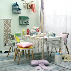 Yemek masası, sandalye, duvardaki raflar, patineli zemin döşemesi, Evdema. Perde, güller, fener, galvaniz kova, Ikea. Katlı cupcake standı, Delicious yazısı, masa örtüsü, peçete olarak kullanılan Amerikan servisler, demlik, fiyonk şeklindeki yastıklar, balerin, kapaklı kova, gecelik, kuşlar, English Home. Beyaz tabure, Koçtaş. Tabaklar, Bernardo. Kalpli ve pembe çiçekli yastık kılıfı, runner, çizgili perde, Zara Home. Şişe, mumluk, beyaz vazo, Mudo Concept. Fincan,Tepe Home. Peçete halkaları, Tatlı Emeklilik.