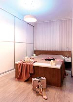 Yatak odasının ismi Masal. İkili hayatı birbirlerine “masal” tadında yaşattığı için bu adı vermişler ona. Mobilyalar Pergel Grup’un mobilya atölyesinden özel tasarımlar. Aydınlatmalar özel tasarım, istenildiğinde mavi led ışıklı ve Tekin Aydınlatma’dan alınmış.