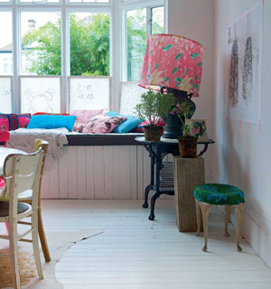 Pencerenin önünde yer alan ünitede mevsimlik tekstiller ve yastıklar bulunuyor. Debi, kendi ruh durumuna göre evde zaman zaman değişiklik yaptığını da söylüyor. Yerde bir inek postu yer alıyor. Duvarda yer alan resim Debi’nin arkadaşı olan ressam Stuart Redler imzasını taşıyor. Hemen yan sehpada yer alan abajur bir zamanlar vazoymuş. Debi bu vazoyu şık bir abajura dönüştürmüş.